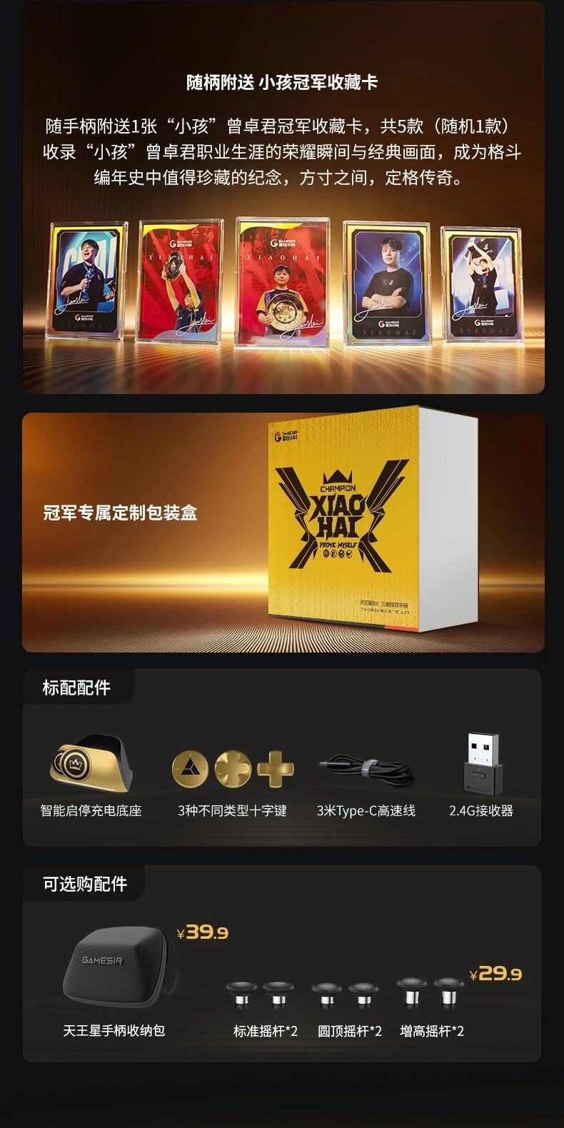 此外,购买天王星8K小孩冠军联名款,还会附送【小孩冠军收藏卡】以及多样配件,还可选购专属手柄收纳包和不同类型摇杆头。