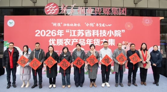 省科协党组成员、副主席夏军、新华日报社副总编辑,交汇点大平台执行负责人杭春燕、南京市科协一级调研员许光明和建邺区委常委、副区长卫明月共同为2026年“江苏省科技小院”优质农产品年货大集开街。