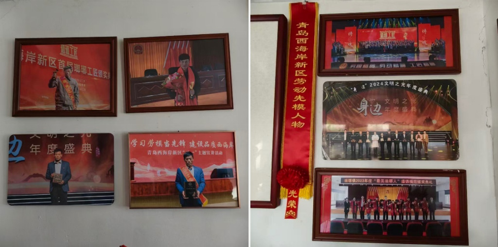 多年来,琅琊古船制造技艺的代表性传承人深耕技艺、潜心传承,凭借精湛的手艺与执着的坚守,收获了社会各界的高度认可。墙上悬挂的“青岛西海岸新区劳动先模人物”绶带、“最美琅琊人”道德模范、“文明之光”“新区工匠”等荣誉牌匾与合影,是对匠人坚守匠心、传承文化的最高褒奖,更是对琅琊古船制造技艺文化价值与社会价值的充分肯定。这些荣誉不仅属于匠人个人,更属于这项沉淀千年的非遗技艺,见证着传统手工艺在新时代得到的尊重与传承。