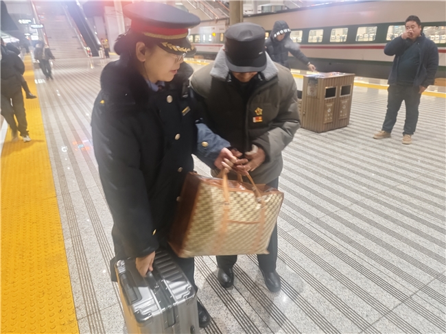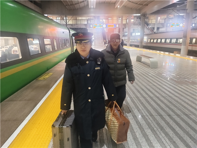 2026年2月9日,春运正在徐徐进行着,列车长刘萌正在站台等候着旅客乘车,突然发现一位年逾七旬的老年旅客因行动不便,在站台上提着许多行李显得有些无助。列车长刘萌发现后,立即上前询问情况,主动伸出援手。他不仅帮助老人拿取行李,并及时找到位置,调整了更为舒适的座位,还细心地端来热水,耐心询问老人需求,并协调乘务员在旅途中给予特别关照。