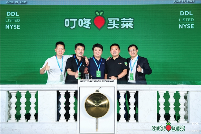 2021年6月红椒资本团队与叮咚买菜梁昌霖上市敲钟合影