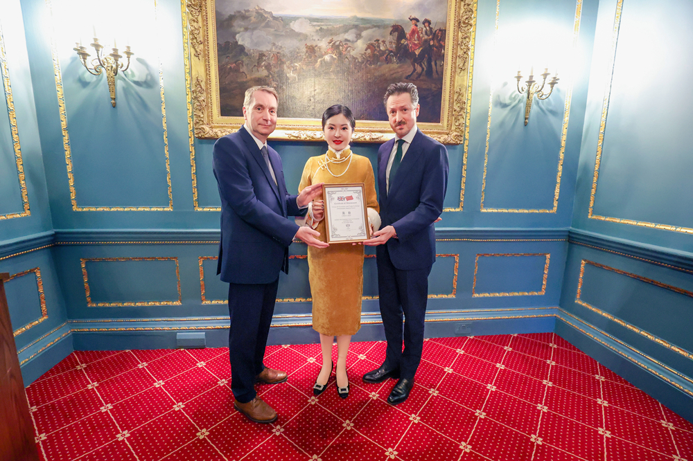 (图为英国西蒙·道格拉斯·汉密尔顿,Duke Simon Douglas Hamilton公爵先生和英国伦敦市政厅一等行政秘书詹姆斯·苏顿First Administrative Secretary City of London James Sutton亲自授予显灵老师中英经贸交流大使的荣誉)