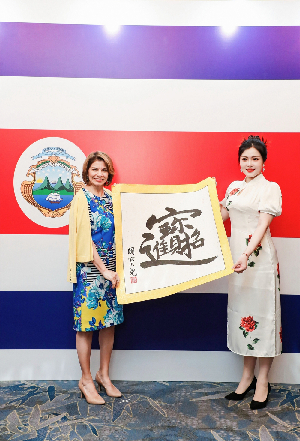 2023年7月14日晚,哥斯达黎加前总统劳拉·钦奇利亚·米兰达在北京接见显灵老师,并收藏其书法符书代表作《招财进宝》。