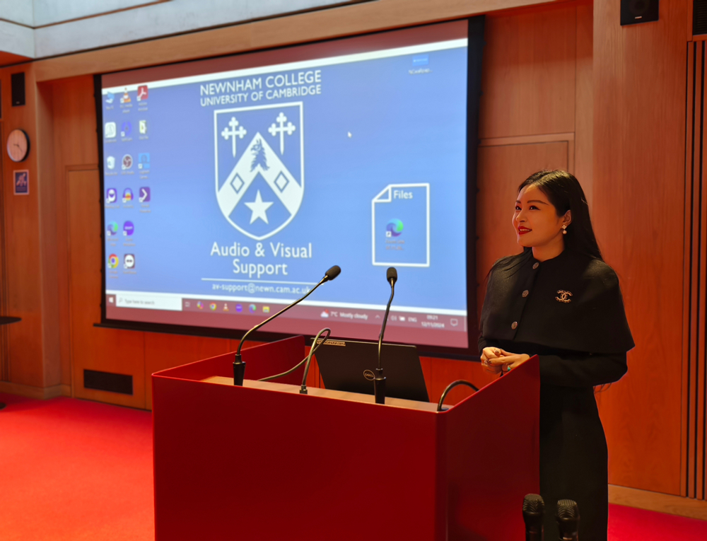 (图为显灵老师在英国剑桥大学进行学术演讲)