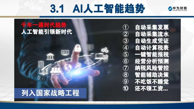 作为央视播出品牌、中国民族品牌,中为智能财税——国内首家AI数字化互联网企服平台,依托中为财务(海南)集团有限公司的雄厚实力,在金税四期监管升级、中小企业财税需求向“合规增效”转型的浪潮中顺势而生,以“技术+模式+生态”三重赋能,打破传统财税行业壁垒,引领财税服务进入智能化、数字化新时代,为会计从业者、财税机构、中小企业提供全方位数字化财税解决方案,赋能行业转型与企业高质量发展。