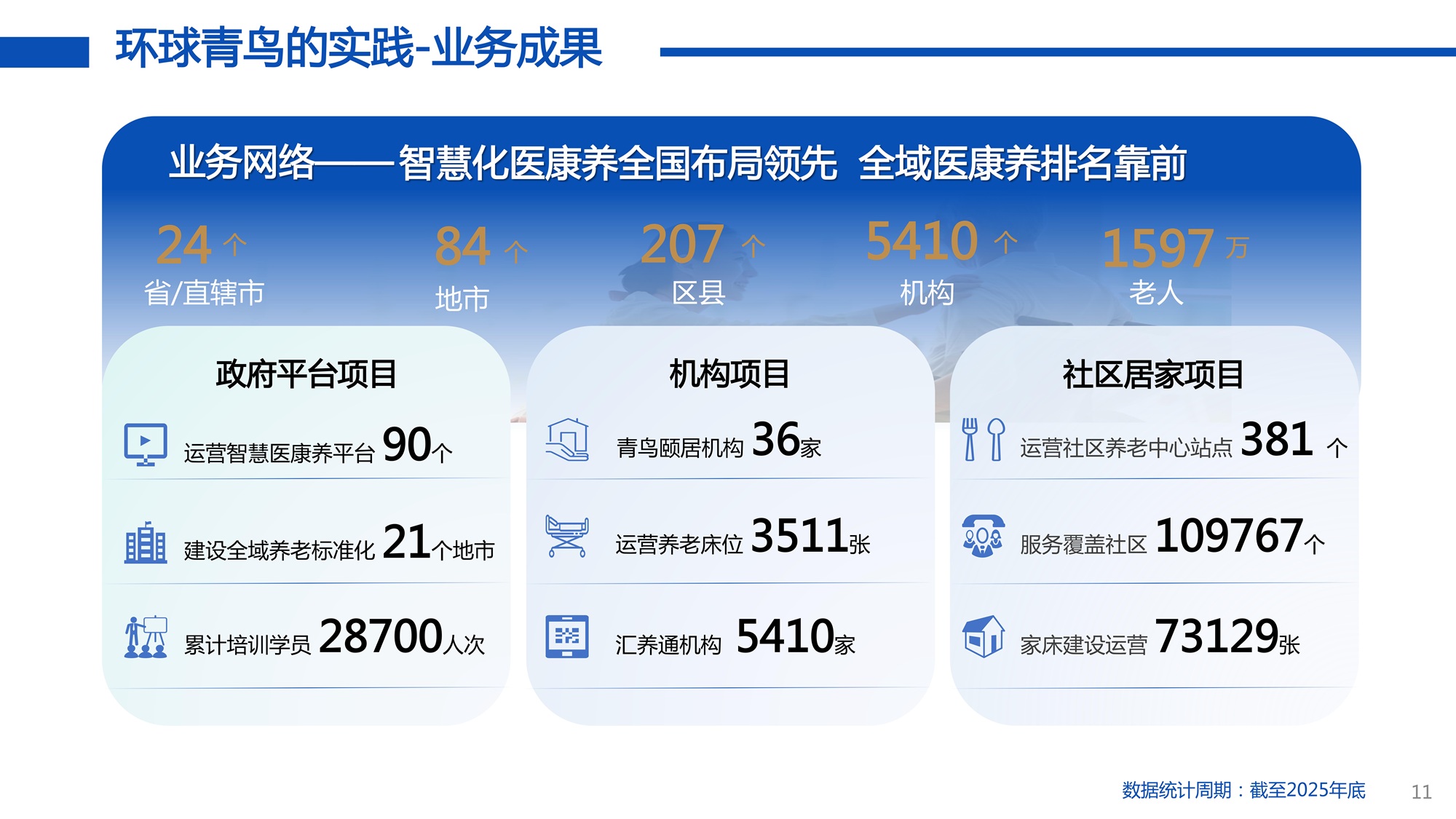 截至2025年12月底,这一融合了智慧与温情的生态网络已覆盖全国24个省(自治区/直辖市)、84个地级市、207个区县;拥有青鸟颐居机构36家,有医养护理型床位3511张;建设并运营90个智慧医康养云平台,为5410家养老机构提供智慧医康养软件服务,智慧化医康养布局已居全国领先地位。它作为一种系统性力量,重新组织资源、激活潜能、传递温度,让“老有颐养”的理想,成为覆盖中国更多城市的现实图景。