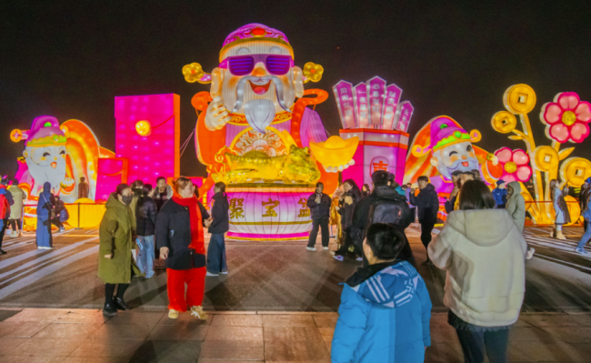 值得一提的是,为丰富游客游玩体验,灯会打破传统灯组静态观赏局限,将AI科技匠心融入灯组之中,为游客带来个性化的赏灯新体验。可爱又不失喜庆的财神驾到灯组前,游客与“财神”实现实时互动聊天,收获满满新春财运祝福。潮玩生肖灯组汇集形态各异的十二生肖形象,游客通过AI交互功能即可测算专属新春运势,解锁个性化运势寄语,成为众多游客打卡祈福的热门点位。赛博时空灯组则主打潮流互动,搭载AI智能换装拍照功能,一键生成氛围感赏灯大片,轻松定格新春美好瞬间。