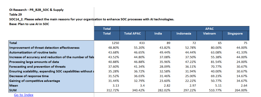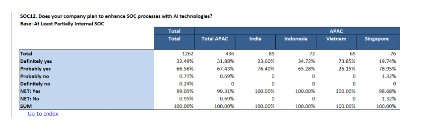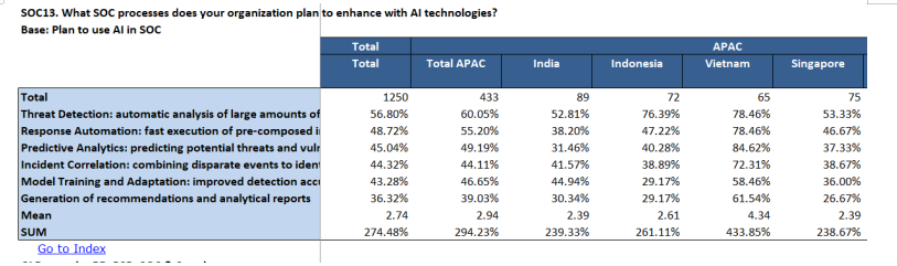 这些期望与该地区安全运营中心采用人工智能的主要动机高度契合:提高整体威胁检测效率(55%)、自动化日常任务(47%)以及提高准确性同时减少误报(45%)。全球范围内,大型企业普遍展现出更广泛、更宏大的规划,致力于将人工智能应用于安全运营中心的多重职能领域。