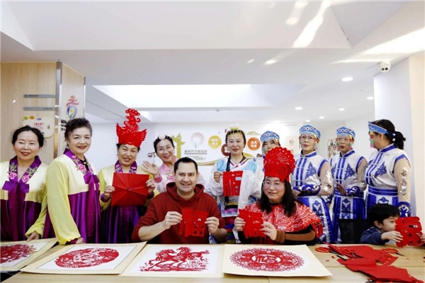 近日,山东威海经开区在皇冠街道万象城社区举办“万象沐春晖 四海一家亲”迎新春民俗文化互动活动。来自英国、韩国等国家的国际友人同各族居民欢聚一堂,沉浸式体验写春联、剪窗花、画国画等中国“非遗”文化,提前感受中国农历新年的魅力。