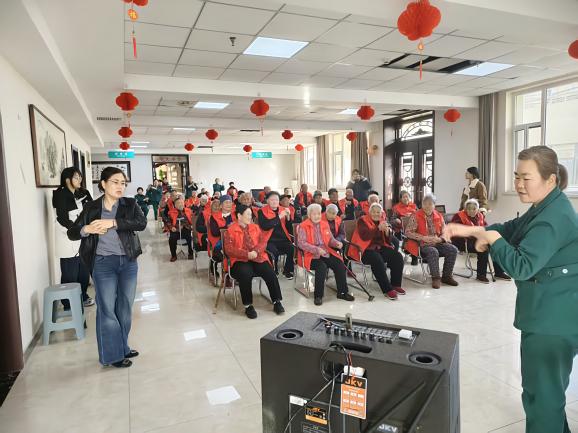 在文化陪伴环节,实践成员们精心准备了集体手势操《桃花朵朵开》。伴随着轻快活泼的旋律,成员们耐心地示范每一个动作,一步步引导长者们跟上节奏。起初,部分长者动作略显生疏,但在成员们的鼓励与带领下,大家逐渐放开手脚,脸上洋溢起孩童般的笑容。现场欢声笑语不断,温暖的气息驱散了冬日的寒意。