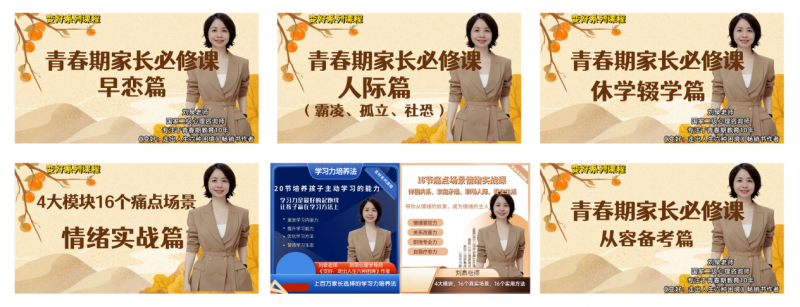 基于十余年实战经验,刘泉打造了一套成熟的课程体系,以 “4 大模块 + 16 个痛点场景” 为核心,覆盖青春期教育、情绪管理、人际关系等关键领域,形成 “著作 + 课程 + 实操” 的完整知识输出链。