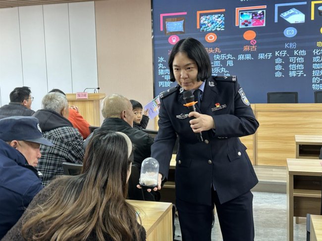 在禁毒宣传环节,民警结合典型案例,以通俗易懂的语言深入解读了“笑气”等新型毒品的隐蔽性、危害性,提醒居民警惕各类伪装成零食、饮料的毒品陷阱。同时,通过展示毒品仿真模型,直观揭露毒品的伪装特征与识别方法,引导居民树立“珍爱生命、远离毒品”的理念,主动提升防范意识,共同守护家庭平安。