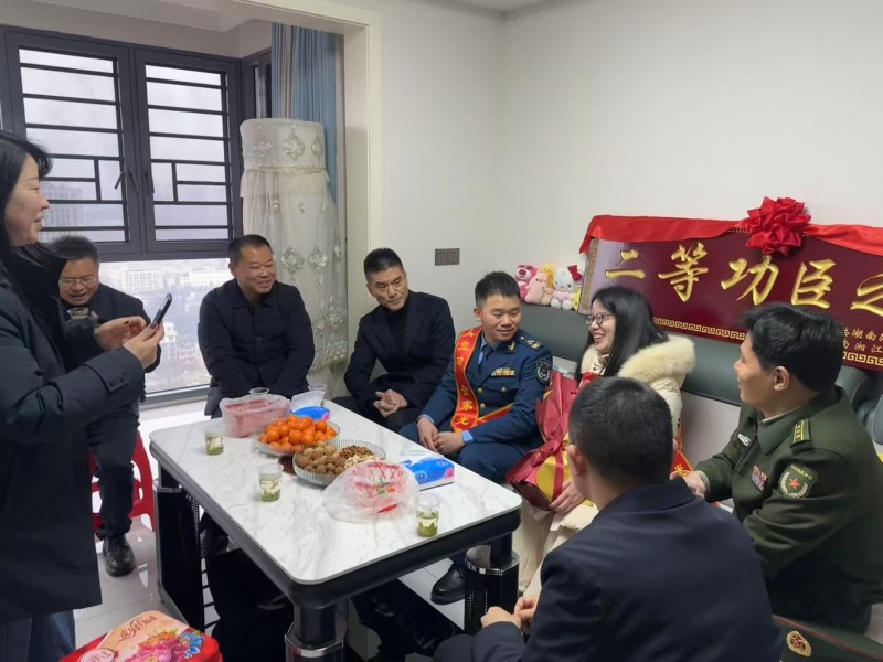 2月9日,湖南湘江新区金山桥街道金江社区处处洋溢着喜庆热烈、尊崇荣光的浓厚氛围,清脆激昂的锣鼓声引得邻里纷纷驻足围观,共同见证现役军人李亮家属收获荣誉的光荣时刻。岳麓区武装部上校政委程志强、湘江新区民政和社会保障局(退役军人事务局)党组成员、岳麓区退役军人事务局局长刘勇、副局长周庆、金山桥街道办事处主任刘志国、党工委副书记陈飞一行专程登门,为李亮家属郑重送上立功喜报、“二等功臣之家”荣誉牌匾与慰问金,代表湘江新区政府向他们致以最热烈的祝贺与最诚挚的慰问。