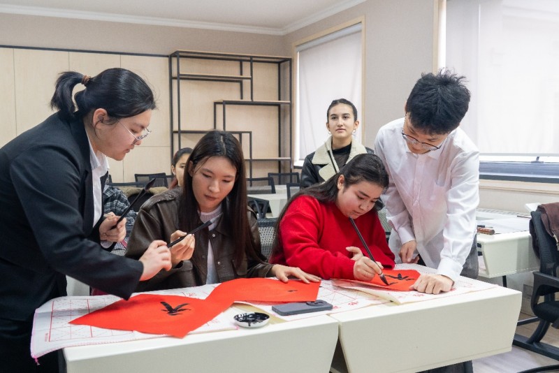 以新春为契机,支队先后走进撒马尔罕外国语大学、丝绸之路国际旅游与文化遗产大学,开展文化交流调研。在撒马尔罕外国语大学,支队成员与当地师生分享中国春节习俗,从贴春联、年夜饭到守岁拜年,一个个充满年味的故事,让中亚师生沉浸式感受中国年的喜庆氛围;在丝绸之路国际旅游与文化遗产大学的书法活动,更是将这场文化之约推向高潮。活动现场,支队成员化身文化传播者,从基本笔法到汉字结构,耐心讲解示范,手把手指导当地师生握笔、运笔。新春氛围里,大家共同书写“福”字,墨香氤氲间,一张张承载美好祝愿的作品跃然纸上。当地学生兴致勃勃地临摹,虽笔法稚嫩,却满含对中国文化的好奇与喜爱,他们拿着自己的作品与支队成员合影,灿烂的笑容定格成中乌青年友好的生动瞬间。