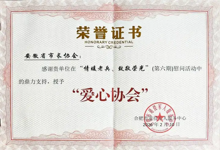 2026年春节将至,为让广大退役军人和优抚对象度过一个喜庆、温暖、安康的节日,安徽省市长协会(以下简称“省市长协会”)、合肥市退役军人服务中心等单位携手爱心企业开展了“情暖老兵 致敬荣光”(第六期)慰问活动。