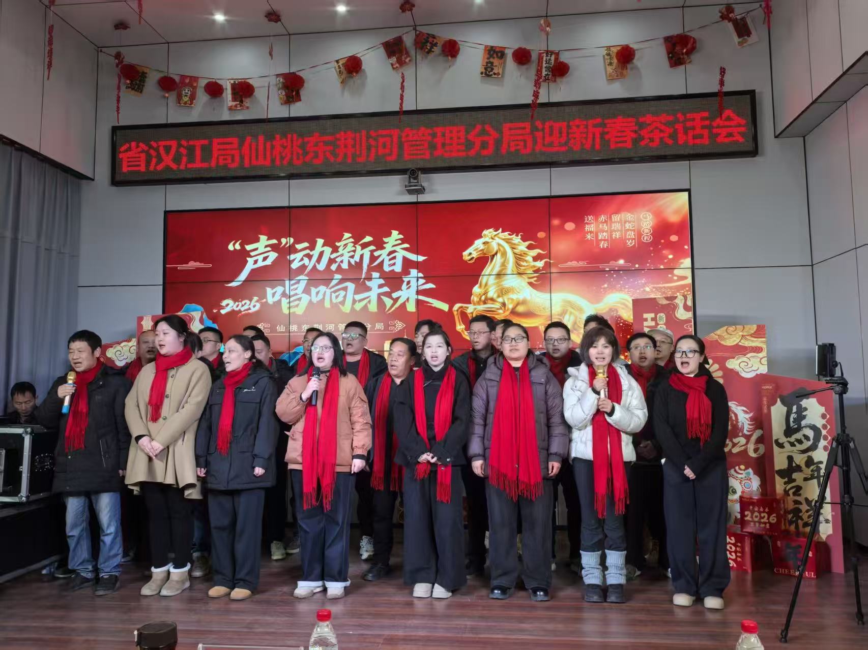 墨香未尽,欢歌又起。分局举办的“声动新春,唱响未来”主题活动热烈开场。分局总支书记首先致辞,全面盘点2025年各项工作取得的显著成效,诚挚感谢全体干部职工一年来的辛勤付出及家属的理解支持,勉励大家在2026年再接再厉、再创佳绩。声乐、武术、器乐等20余个节目轮番上演,活动还穿插“马不停蹄”“踩气球”等趣味互动游戏,现场氛围持续升温。《歌唱祖国》《祝你平安》《军港之夜》等经典曲目,唱响了汉江人扎根基层、履职尽责的赤诚;武术表演《咏春拳》、乐器弹唱《我记得》,展现了汉江人的多才多艺;《月光》《小美满》等歌曲,道出了青年职工对生活的热爱与向往;文艺轻骑兵带来《我爱汉江水》《红星照我去战斗》等水利主题歌曲,唱出了汉江人守护碧水安澜的初心与担当。台上台下歌声相融、掌声相和、互动频频,现场化作一片欢乐的海洋,大家在嘹亮歌声中共迎新春、传递喜悦。