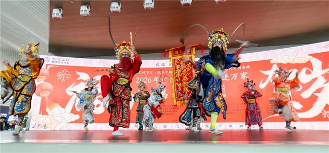 活动尚未正式开始,现场已年味氤氲、人气高涨。极具岭南民俗特色的英歌舞率先点燃全场热情,铿锵鼓点震彻航站楼,节奏明快、气势如虹。身着传统戏服的舞者们手持英歌槌,脸谱鲜明、身姿矫健,跨步、顿足、转身、击棒等动作刚劲有力,每一次槌落都伴随着震耳欲聋的呐喊,尽显潮汕儿女豪迈洒脱的精气神。舞者们时而列队行进、时而对打互动,磅礴的锣鼓声、刚劲的舞步与雄浑的呐喊将新春祈福的美好愿景展现得淋漓尽致,赢得现场观众阵阵喝彩,不少旅客纷纷驻足观看、拍照打卡,纷纷拿出手机记录下这一热闹瞬间。
