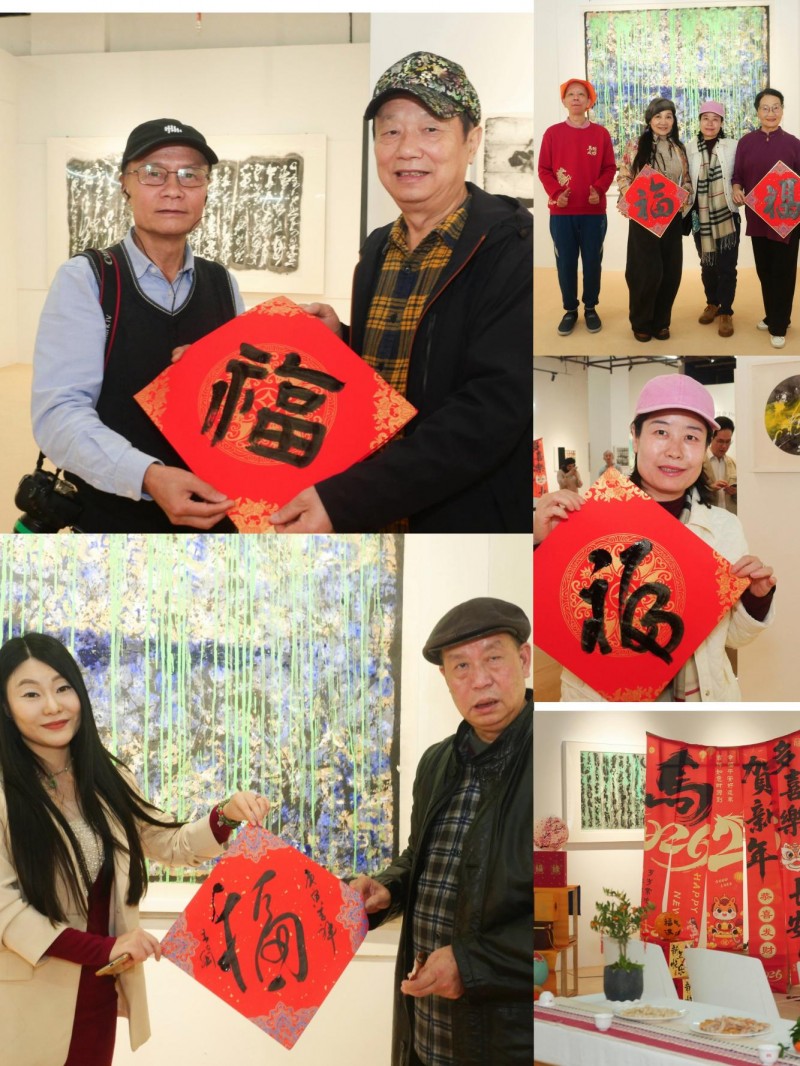16时20分,活动进入“书法挥春·众宾寄愿”环节。经多环节沉浸,众人春意盈然、执笔寄情。王仲刚挥毫写下多种字体的“福”与“马”,以“马上有福”祈福;郭琦凝神书“福”,寄托安康祝愿;李纲挥就“马上有钱,马上有福”,笔力苍润、墨韵十足。艺术爱好者亦纷纷提笔,或书“福”“春”,或拟短句,案前墨香氤氲,书法成为众人表达期许、联结人心的载体。