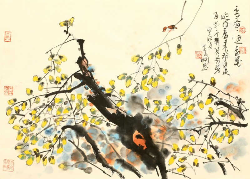 “观画·丹青写春”环节,主持人向李纲请教水墨与立春的联结。李纲娓娓道来:“冬春之交,阳气初生而寒气未退,‘将萌未发’最考水墨层次。《立春》中,我以淡墨破冰、湿墨润土,枯笔绘枝、焦墨点苔,皆是春信将至的停顿。”他引导观者细察:“左下角梅花是立春第一花信,远山淡影藏归雁翅梢,是天地第一笔‘动’。”众人观墨寻春,纷纷称妙。
