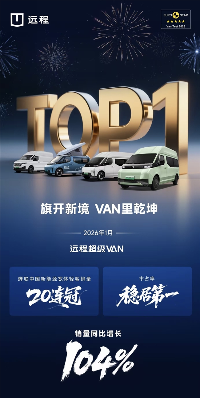 2026年1月,远程超级VAN以领先姿态强势开局,蝉联新能源宽体轻客销量冠军,达成“20连冠”。当月销量同比增长104%,市占率稳居第一,用实绩赢得新年开门红,展现出持续领先的增长韧性与市场号召力,进一步巩固领跑者地位。