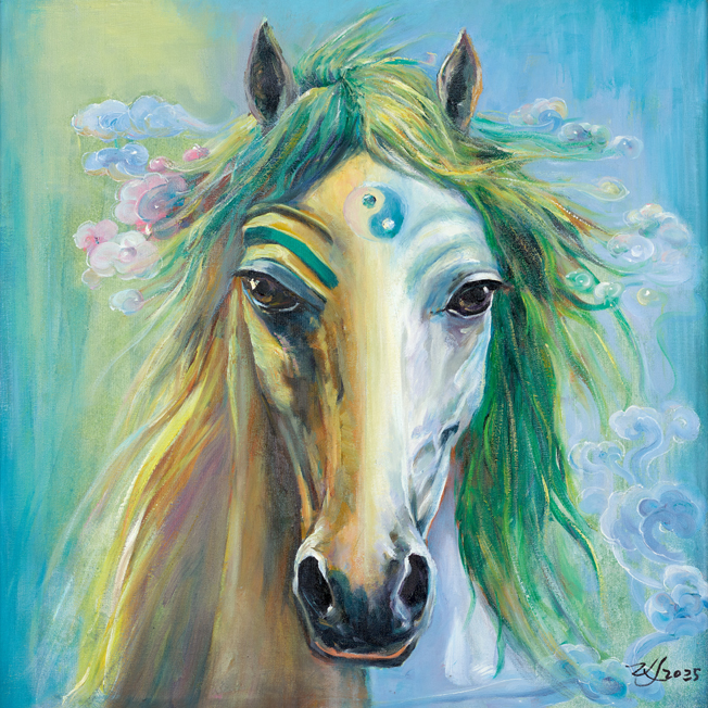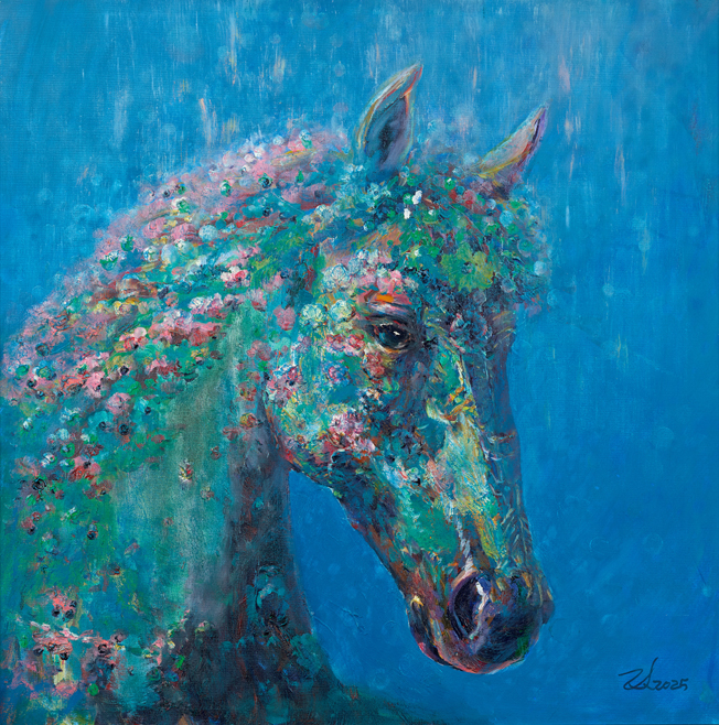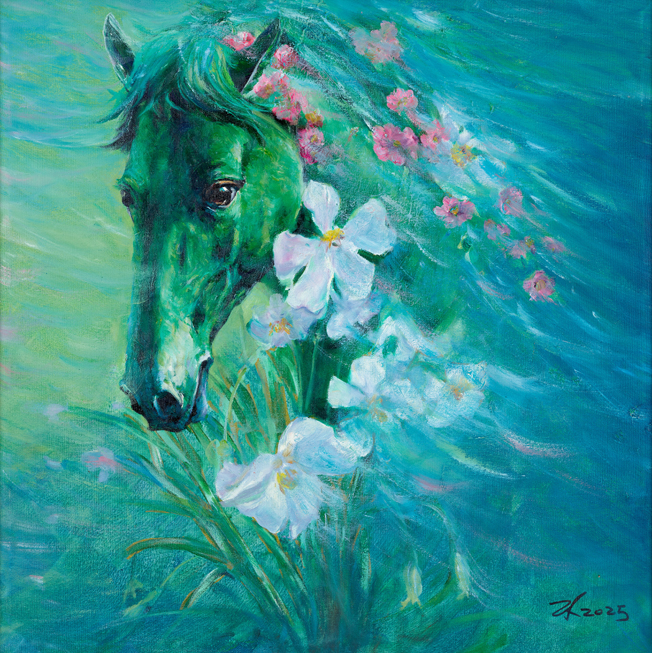 《策马迎春》以超现实色彩重构春日意象。艺术家跳出传统骏马的写实范式,以青翠绿调为马的主体色,将草木新生的生命力与骏马的精神内核相融,是其 “用我手写我心” 的典型表达。画面中,奔放的笔触兼具西方油画的肌理质感与东方写意的空灵,随风舒展的鬃毛化作流动的碧波,点缀其间的繁花成为迎春的信使。作品突破物象束缚,将 “策马迎春” 的吉祥寓意升华为对生命复苏、万物共生的礼赞,实现了传统新春文化与当代艺术语言的完美碰撞。