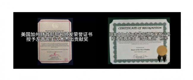 2022年,左晋被加拿大政府授予“加中文化交流大使”称号,并获得加拿大议会颁发的“伊丽莎白二世女王钻禧纪念勋章”。他长期捐赠作品支持慈善事业,被“美丽中国”评选为“中国十大慈善艺术家”之一。