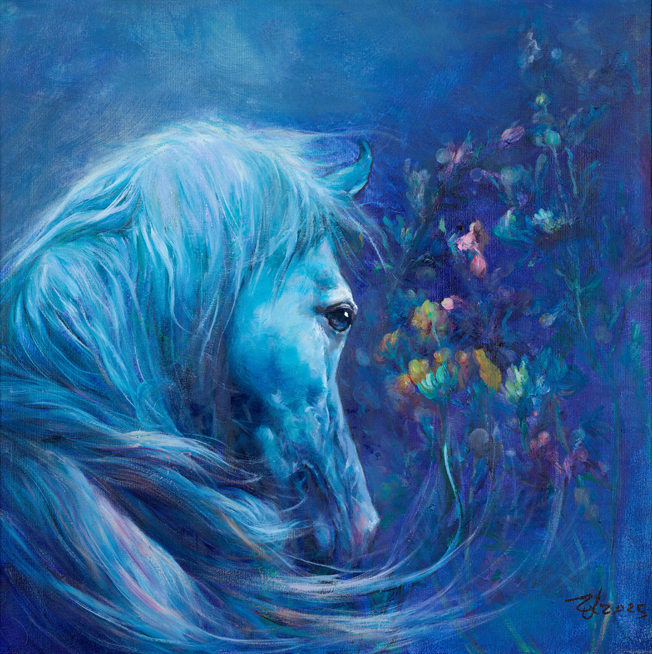 这幅《梦马生花》是左晋“悟象”艺术的诗意表达,以超现实的色彩与笔触,构建出梦境与现实交织的奇幻图景。画面中,通体幽蓝的骏马如从深海或梦境中走来,飘逸的鬃毛化作流动的水纹,与右侧绚烂的繁花相互呼应,打破了动物与自然的边界。艺术家以细腻的肌理与晕染技法,让冷调的蓝与暖调的花形成强烈对比,既凸显了马的灵动,又传递出“梦生花”的浪漫意象。作品以“悟象”的哲思,超越了传统写实的桎梏,将“梦马生花”的美好寓意升华为对希望、生机与无限可能的礼赞,实现了东方诗意与当代艺术语言的深度融合。