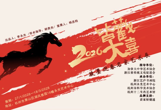 甲辰岁末,丙午春归。“皆大欢喜”—2026骏墨迎春名家艺术展在杭州永光艺术中心正式启幕。加拿大中华艺术协会会长、大西洋美术家协会会长、悟像画派创始人左晋系列作品特邀展出。这场由李永光担任出品人、胡贵杰提供学术指导、杨丞钧策展的艺术盛宴,汇聚海内外名家力作,以“骏”为魂、为马年新春注入浓郁的文化气息与团圆喜乐。为市民游客献上浓郁的艺术年味。