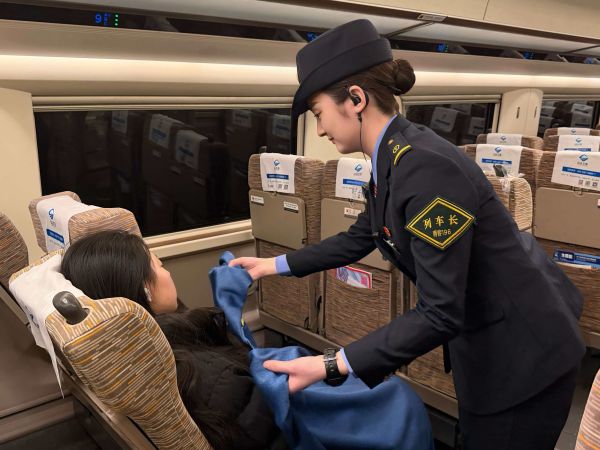 列车的车厢内灯火温馨。一位女旅客因赶车匆忙,上车后突发高烧,浑身发冷地蜷缩在座位上。于红艳巡查时发现后,立即取来干净的毛毯,小心翼翼地为她盖上,又快步端来温热的开水,一遍遍叮嘱她注意保暖,并及时联系了站外等待的家人进站接站。