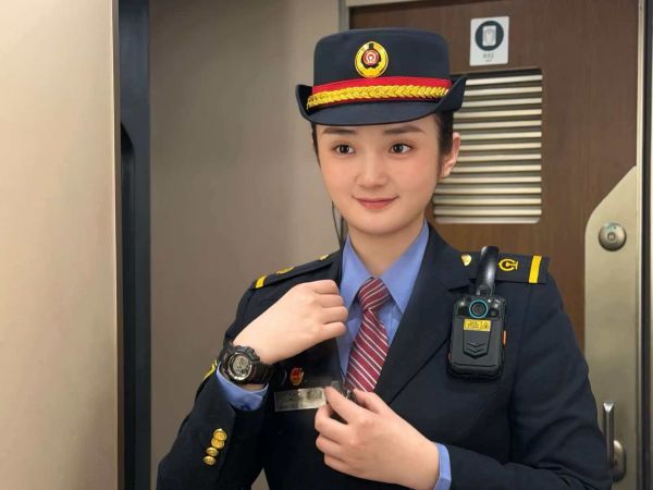 值乘前,于红艳仔细整理着制服,将工作牌一一佩戴整齐。深蓝色的制服、红色条纹的领带,还有腰间的对讲机、胸前的执法记录仪,这些不仅是她的“标配”,更是守护旅客平安的“武器”。