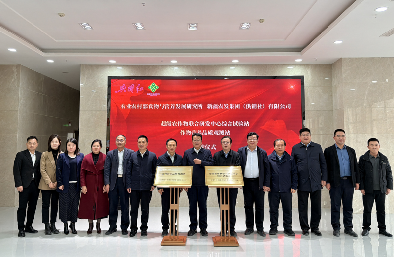 为推动品种培优、品质提升、新疆粮食标准化生产,2026年2月9日,农业农村部食物与营养发展研究所与新疆农发集团(供销联合社)有限公司共同在新疆生产建设兵团图木舒克市举办作物营养品质观测站暨超级农作物综合试验站揭牌仪式,中国乡村发展协会执行副会长李金祥、农业农村部食物与营养发展研究所所长王凤忠、中国乡村发展协会办公室主任吴胜军、新疆生产建设兵团第三师副师长、图木舒克市人民政府副市长张勇、新疆农发集团(供销联合社)有限公司党委书记、董事长谢瑛、食物营养所营养导向农业与食物发展战略团队首席黄家章研究员、小麦育种专家、高产农作物产业化发展专业委员会主任委员程魁共同出席并见证揭牌仪式。