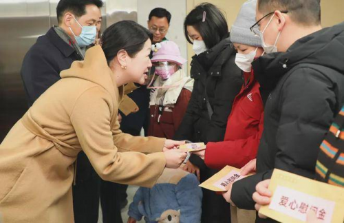 ▲为湖南省人民医院患儿家庭送上爱心慰问金和慰问物资
