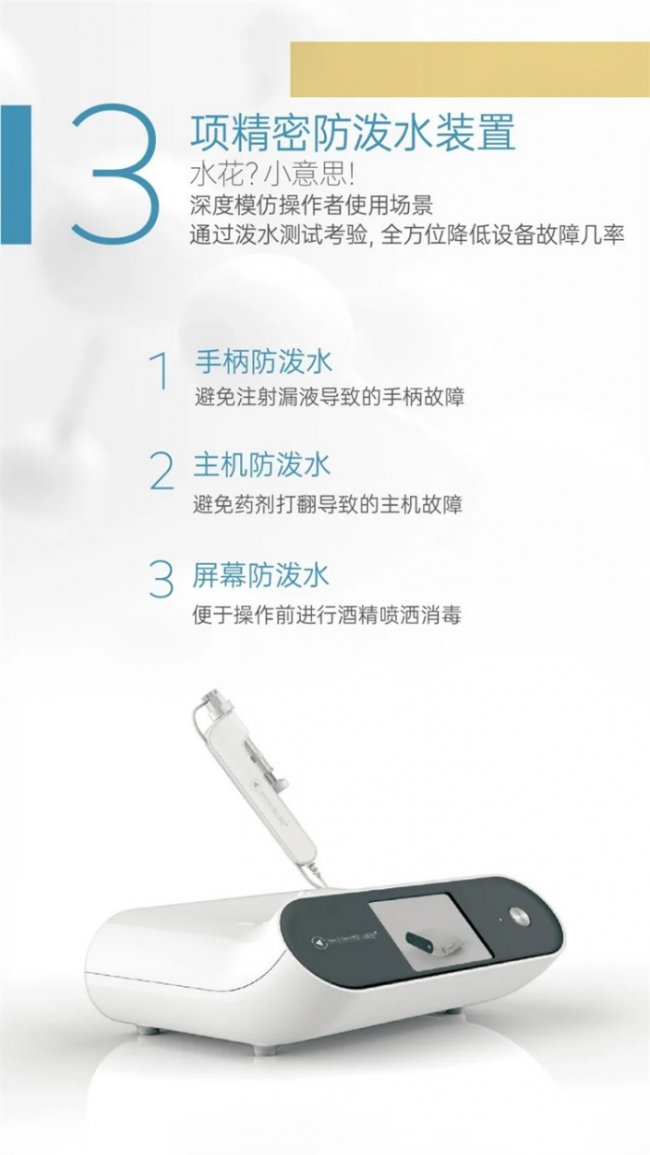颜层®皮下电子注射器控制助推装置是整体防水设计的,主机、手柄、主机加盖防水装置,经过严格防水试验的检测,有效地防止了液体进入手柄后导致的故障。还拥有24小时云端响应,携带自动报警装置。当设备连接不当、未及时保障或未贴合操作时,系统自动警报提示,及时更正。