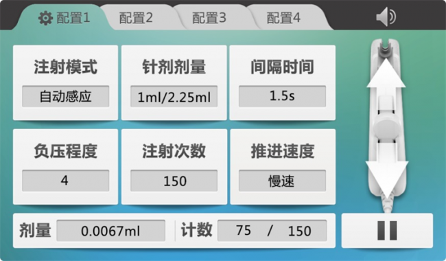首先,颜层拥有足足7寸的大屏,一眼看上去就非常清晰,简单易操作的界面设定,除了有全中文的提示之外,更是一键式操作。注射模式,针剂剂量和间隔时间,负压程度,注射次数,推进速度都可以多种模式一键式操作,里面有10-180注射次数可选,0-10负压可以选,4种参数记忆卡,3种注射模式,这些都可以直接选择数值与模式,无需一直按键选择,缩短设置时间,药液快速设置指南,系统精准测算单发剂量,简单方便。