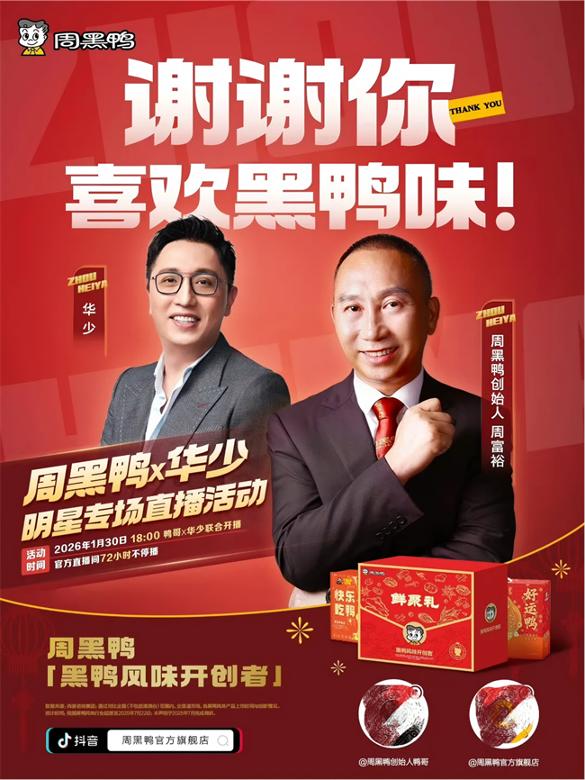 周黑鸭此次春节营销的成功破圈,既以走心的感谢传递了品牌温度,更凭硬核的产品实力彰显了品牌理念。这不仅是一次营销的出彩,更成为周黑鸭2026年发展的精彩序章。作为黑鸭风味开创者,周黑鸭将始终秉持责任与担当,坚守“心”质生产力,持续以创新推动品质升级,引领卤味行业迈向更高质量的发展新阶段!(文章来源:食品板)