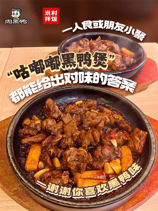 除产品外,“风味”仍然是周黑鸭最鲜明的标签。2025年8月,周黑鸭获权威机构认证为“黑鸭风味开创者*”,开创并持续定义经典黑鸭风味标准,构建了差异化的核心壁垒。除了深耕卤味主业,周黑鸭还与盐津铺子、米村拌饭等品牌合作,推出了“经典黑鸭风味虎皮鳕鱼豆腐”“咕嘟嘟黑鸭煲”等跨界产品,让黑鸭风味融入更多的日常消费与餐饮场景。在食品板看来,如今,周黑鸭已经完成从“风味输出”转向“场景共生”的跃迁,不再是单纯输出标准化风味产品,而是深入洞察不同场景下的用户需求,让风味适配场景、产品服务场景、品牌融入场景。通过将“黑鸭风味”渗透多元场景生态,实现用户群体的扩容和品牌价值的升级。
