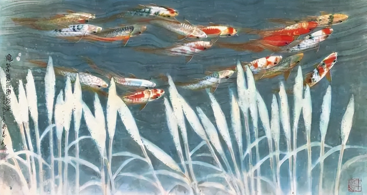 正是源于眼中之美,陈义水的鱼才很真实,又很有意境,很多评论家皆称之为“鱼水相融”,这一定是他的绝招,也是他最引人注目的风神。面对陈义水的画面,犹如凝望锦鳞游泳的鱼池,亦如欣赏一幅色墨交融的抽象画,而放眼历代画家画鱼,要么如黄慎、华喦一样,一条大鱼“跳龙门式”占据整个画面,虽然夺人眼球,却吓人一跳;要么如齐白石、吴作人、吴青霞一样,大面积留白,美其名曰,留白处给人想象的空间,却不知想象源于何处?如果不是出自名家之手,观者真不知画家意欲何为?传统画家之所以或留白、或一条大鱼高高悬空,皆因没有系统训练过色彩、光阴、透视、造型等表现语言的缘故,说白了就是不会画、画不好,非要扭扭捏捏,“强说愁”,也只能“逸笔草草,不求形似”了。当代画家身处一个文化大发展、大繁荣的时代,如果再高举传统的局限,奉为经典,实属自欺欺人,当代画家应该直面不足,才能实现突破,才能“笔墨当随时代”,走向未来。反观陈义水画鱼,则有水、有鱼,水因鱼而动,鱼因水而活,生动的鱼、流动的水在色彩、光影的映衬中相互交融,有具象、有意象、有抽象、有写实,当具象与意象神遇迹化,具象之鱼得乎寰中,意象之水超于象外,当抽象与写实统合一体,则有意趣、有真实,亦有想象空间,意趣不失真实,真实却不面面俱到,而是各臻其妙,各得其所,看似不经意,却实现了“致广大、尽精微”的艺术升华。