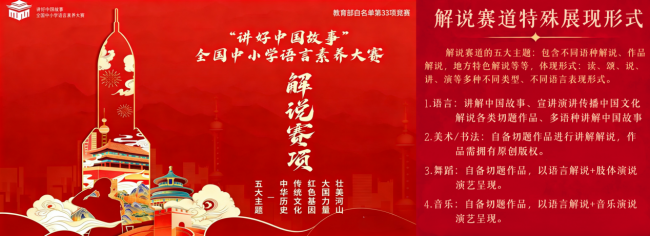 基于此,“讲好中国故事”全国中小学语言素养大赛设立解说赛项,旨在引导青少年通过这一富有感染力的形式,主动探寻并讲述中国故事。本赛项精心设计了以“解说视频”为核心载体,鼓励选手结合自身兴趣、认知与特长,围绕“中华历史、传统文化、红色基因、大国力量、壮美河山”五大主题领域进行自主选题与创意表达的比赛方式。赛事通过初赛、复赛至全国总决赛的阶梯式赛程,系统锻炼并全面展现青少年在内容理解、信息整合、语言组织、艺术呈现及临场思辨等方面的综合素养,为每一位参与者提供实践与成长的舞台,让每一位参与者在实践的舞台上,成长为自信的中国故事讲述者。