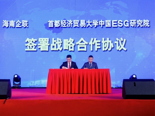 包洪文与柳学信共同签订海南企联与首都经济贸易大学中国ESG研究院战略合作协议。