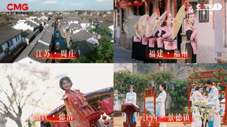 在江苏周庄,乘船喝阿婆茶、品定胜糕,舟船摇曳间,新春的祝福随水波流转。在福州的罗源溪尾街,闽剧唱腔与茉莉茶香交织,将“有福之州”的年味化成舌尖百味。在浙江德清,蚕花姑娘撒花祈福,马灯舞队跳出对丰收的祈愿,在莫干山民宿围炉煮茶的度假式过年也成为新年俗。在江西景德镇,瓷乐悠扬,太平窑火光升腾,在瓷韵窑火中,迎接温暖新春。