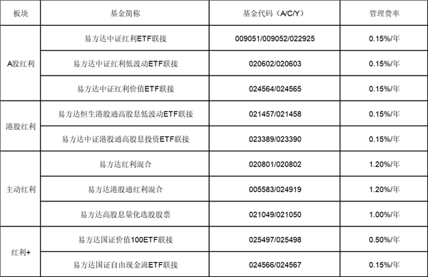 对于追求定期现金流、以分红支撑日常开支的投资者,可配置分红节奏不同的易方达恒生港股通高股息低波动ETF联接基金(A/C:021457/021458)、中证红利低波动ETF联接基金(A/C:020602/020603)和中证红利价值ETF联接基金(A/C:024564/024565),有机会每个月都获得分红。若偏好简化配置,易方达中证港股通高股息投资ETF联接基金(A/C:023389/023390)每月开展一次分红评估,助力直接锁定月度稳定现金流。