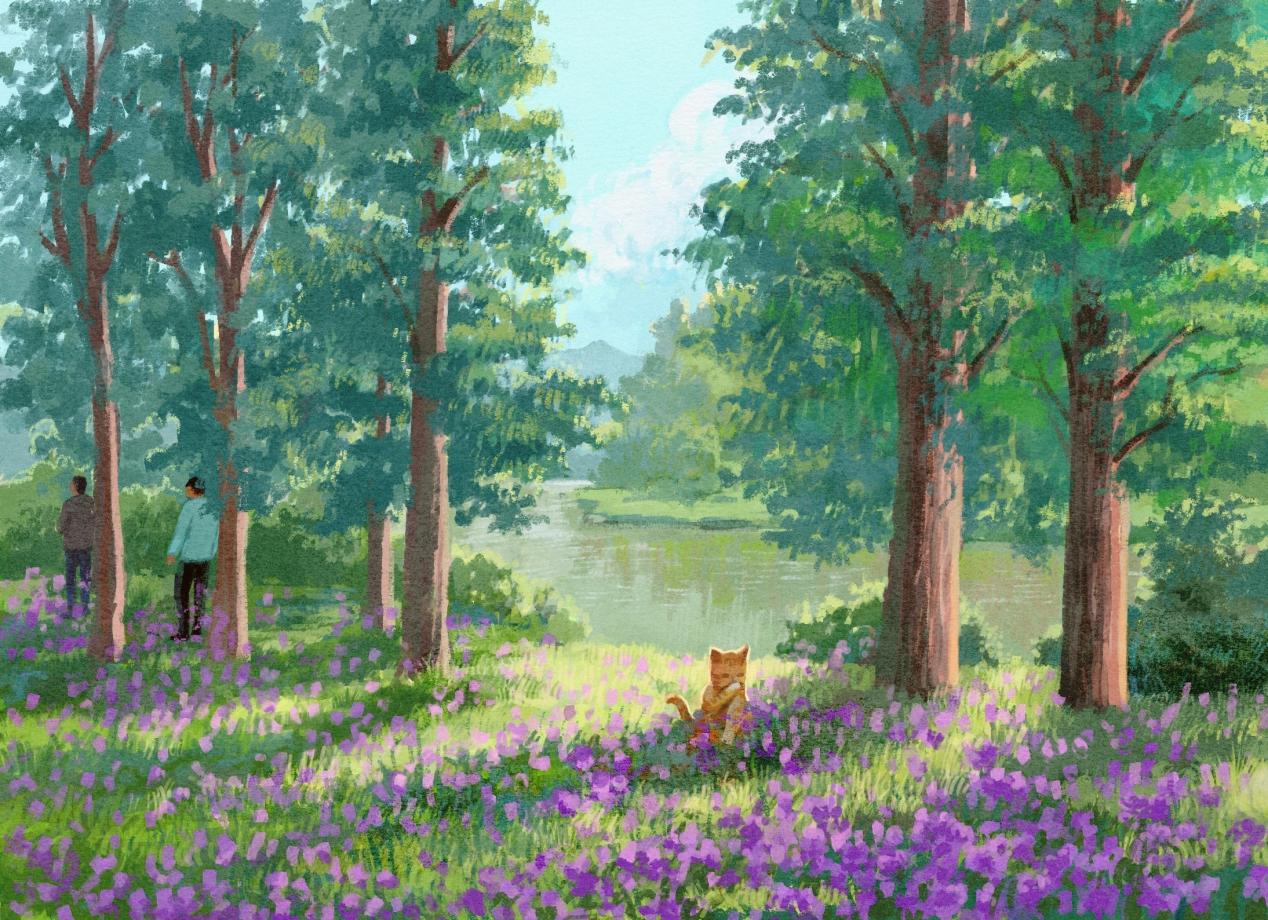 什么是春天?许是最初这个主题是灵光一现的产物,我陷入了沉思。当时是一直都没有思路的,直到在一个晴朗的周末午后,母亲让我陪她一起去逛南京郊区的小众景点,我才在头脑中有了些许答案。那是一块长满水杉的土地,水杉底下充满着二月兰。微风吹来,树林发出“沙沙”的声音,二月兰也在风中摇曳,看到这个场景,我心中压抑了几天想不出来的思路突然在那一刻爆发出来。这里的游客因为景点小众而并不是很多,动物倒是不少,经常会看到在花丛中的小猫身影。也就是在那一刻,我感受到了治愈以及世界上的美好与温馨。所以,我决定从中提取了一部分元素,成为了现在春天画作的一份子。