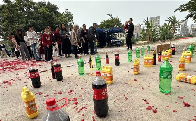 套圈区域洋溢着欢声笑语。地上摆满用捐款统一采购的酱油、洗洁精、饮料、食用油。村民们排起长队,手持套圈瞄准目标。每当套中,现场爆发出阵阵欢呼。