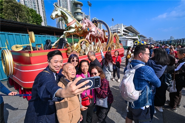 作为很多香港市民过年的传统项目,“马年赛马日”将新春仪式感铺陈至沙田马场的各个角落。马会行政总裁应家柏、马会“马年大使”郭富城和知名艺术家马兴文共同为“融马情国际艺术巡展”揭幕。两匹融马双骏艺术雕塑当天在马场亮相,双骏气势如虹、并肩奔跑,象征马会与社区同行。场内大型桃花林、风车阵错落有致,恰应了“春风得意马蹄疾”的好意头。曾亮相年初一“新春国际汇演之夜”的马会精美花车亦移师场内,万千游客与之合影留念,将维港沿岸的欢腾气息一路延伸至赛道之畔。观众在赛道边观看赛马、振臂呐喊之际,除了能充分感受到马匹拼搏进取的精神外,亦纷纷许下“马到成功”的新年愿望。
