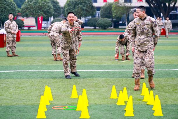 游园会竞技区率先点燃热情。“一圈定乾坤”场地前,官兵们手持彩圈凝神瞄准,彩环在空中划出优美弧线,“啪嗒”一声精准套中奖品,瞬间激起阵阵欢呼;“百发百中”靶场飞镖破空,气球应声而爆,喝彩声此起彼伏;“投壶竞技”区则流淌着古韵雅趣,竹箭破空入壶的清脆声响中,尽显文武兼修的风采。
