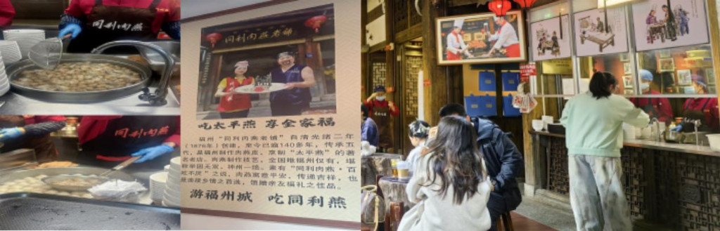 同利肉燕非遗体验点作为“古厝福”与“技艺福”融合的代表,以“守正创新”为理念,实现了非遗技艺与古厝活化的双重突破。团队实地了解了肉燕制作技艺,深入调研其在保留传统风味的基础上,如何通过“体验式消费”“文创衍生”等方式实现非遗产品的创新转化,重点分析了古厝空间活化与非遗产品开发的协同效应,为研究“古厝+非遗”类福文化文旅产品的转化模式提供典型案例。