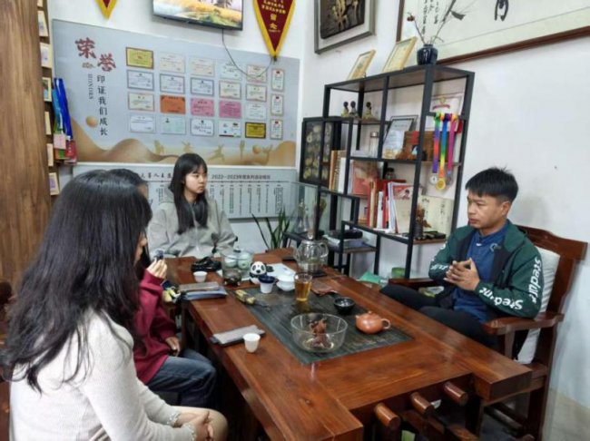 离开酒坊,队员们前往桃溪镇的茶园,走访武平绿茶制作技艺传承人兰正盛。从鲜叶采摘的“一芽一叶”标准,到炒青时“抖、搭、捺、拓”的手法把控,再到手工塑形的力度掌握,兰正盛深谙传统绿茶制作的精髓。他在坚守传统工艺的基础上,鼓励弟子探索创新,研发出冷萃绿茶、绿茶粉糕点等多元产品,拓展了武平绿茶的应用场景。此外,兰正盛还积极推动茶艺与教育融合,频繁走进中小学开展茶艺研学活动,通过识茶、泡茶、品茶的实践教学,让茶香飘入校园,在青少年的心田中播下馨香的种子。
