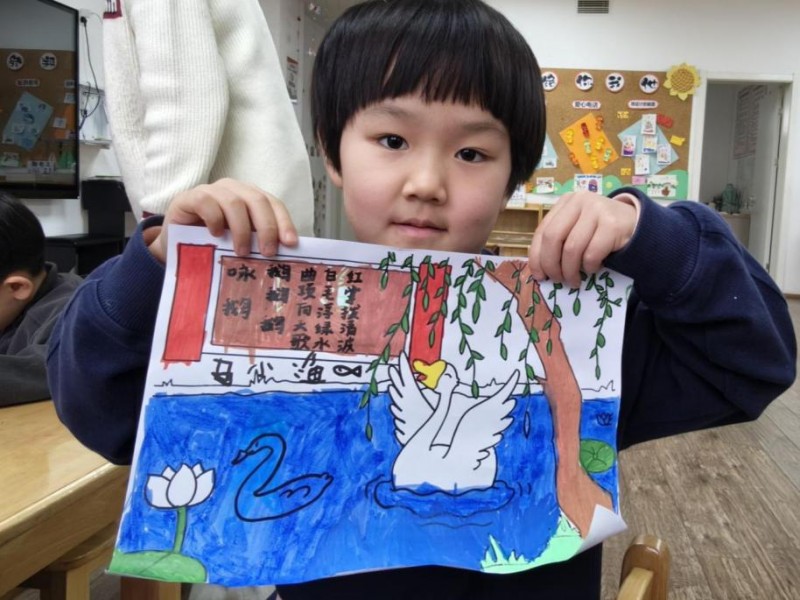 创作完成后,实践队员组织了小型“诗画展”。孩子们手持自己的作品,轮流上台讲述画中的故事。“我画的是大白鹅在清清的河水里唱歌,它的羽毛白白的,水波是青青的。”一名孩子在分享《咏鹅》画作时说道。实践队员借此延伸,引导孩子们观察诗中描绘的自然之美与生命活力,将古诗意境与热爱自然、善于观察的品格培养自然衔接,让文化体验不止于艺术表达,更浸润至情感与审美启蒙。