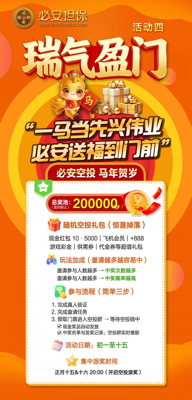 新春伊始,万象更新。必安担保平台以“马上迎春,福聚必安”为主题,推出系列新春活动,其中【瑞气盈门】贺岁空投活动以丰厚奖池、创新玩法和便捷参与流程,成为用户迎接马年的重磅惊喜。此次活动总奖池高达200,000元,涵盖现金红包、飞机会员、游戏彩金等六大类超值礼包,旨在回馈用户长期支持,共庆佳节祥瑞。