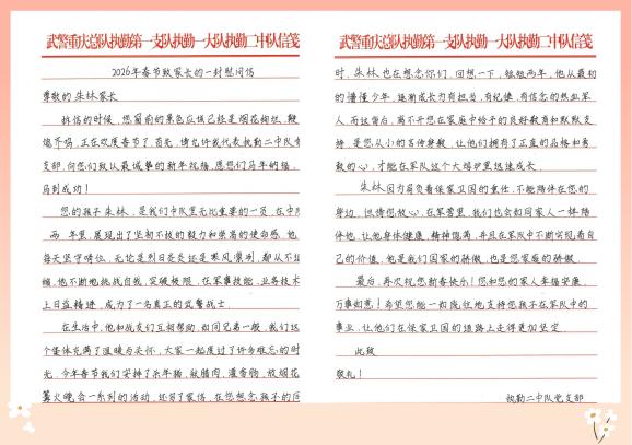 一页信笺,不过方寸之间,却装下了山海相隔的牵挂。当父母读到“儿子现在能独当一面”时的骄傲,当官兵看到“家里一切安好”时的安心,当部队收到“感谢培养”时的欣慰——这便是“家育共管”最好的模样。愿这一封封家书,能让每个军人家庭都暖在心头,也让这份军民同心的情谊,在岁月里愈发醇厚绵长。(武警重庆总队执勤第一支队 汪杰、郭传伍、姚毛毛)